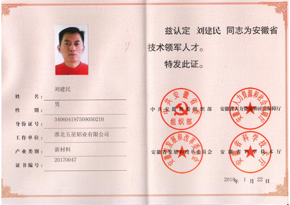 2018年1月22日,我司總經(jīng)理劉建民被認定為安徽省技術領軍人才。